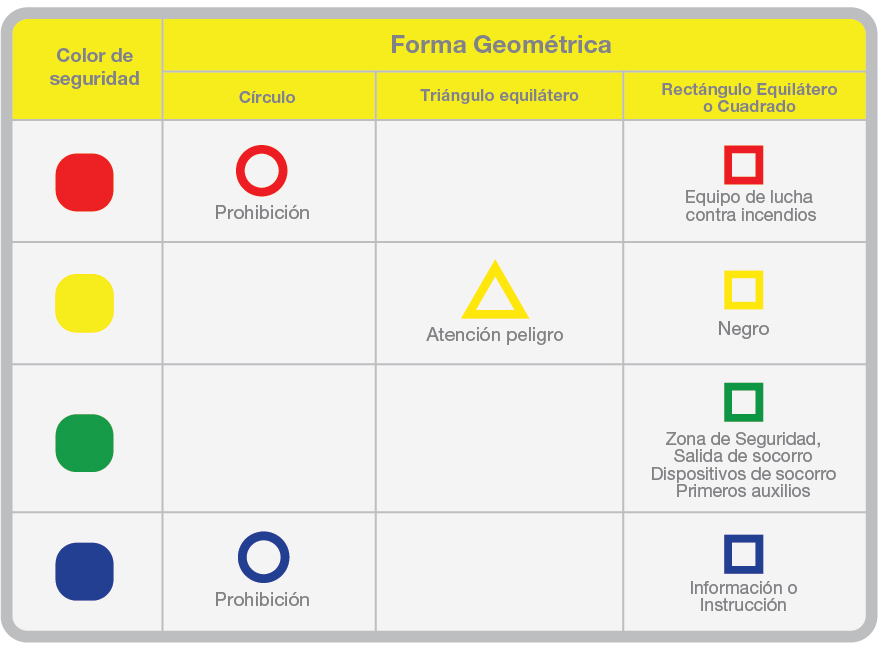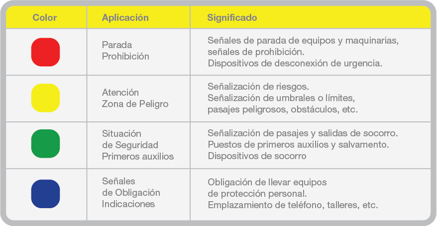 Los colores de seguridad serán los que se señalan en el Cuadro 1, en donde se indican tipo y significado, así como ejemplos de aplicaciones fundamentales para las que se empleen los citados colores.